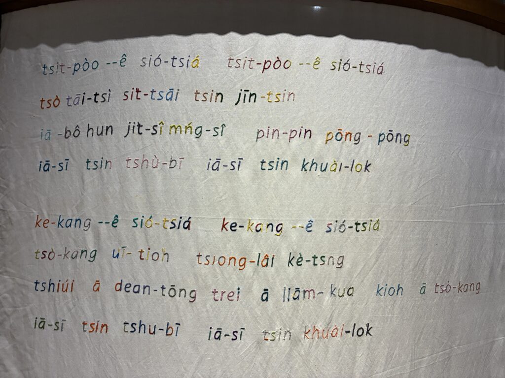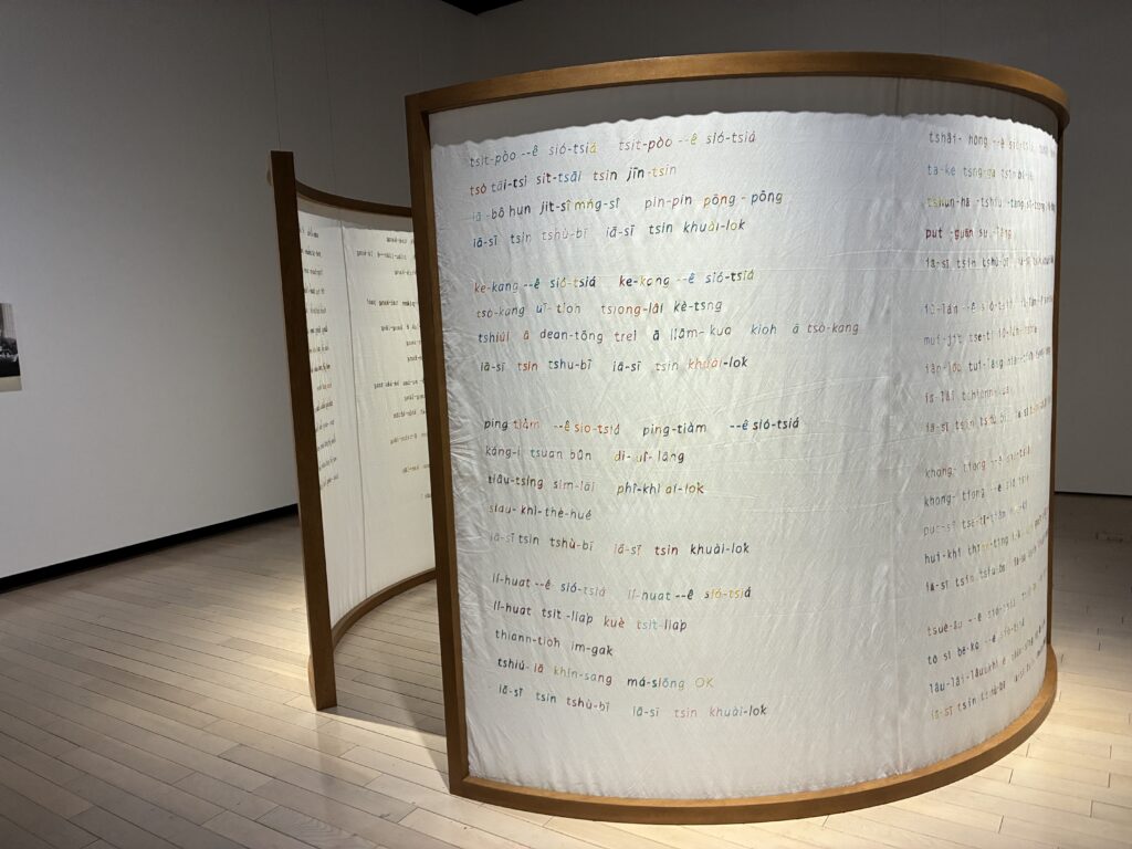 今作はそのような曲の歌詞を布に刺繍して、言語の背景にある複雑な歴史、労働状況、社会階級を浮き彫りにしています。
