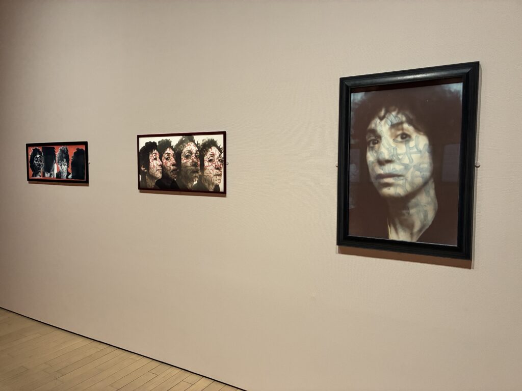 深夜に地下鉄や鉄道駅に設置されたブースで撮影した自身の写真を元に手書きで暗号のようなものを書きこんだ作品です。