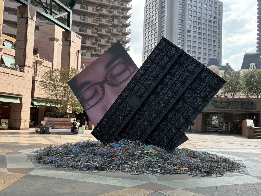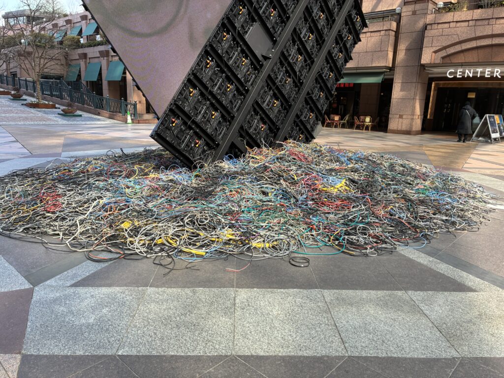 足ともには無数のケーブルが広がっています。情報時代のコミュニケーションがこの作品のテーマです。