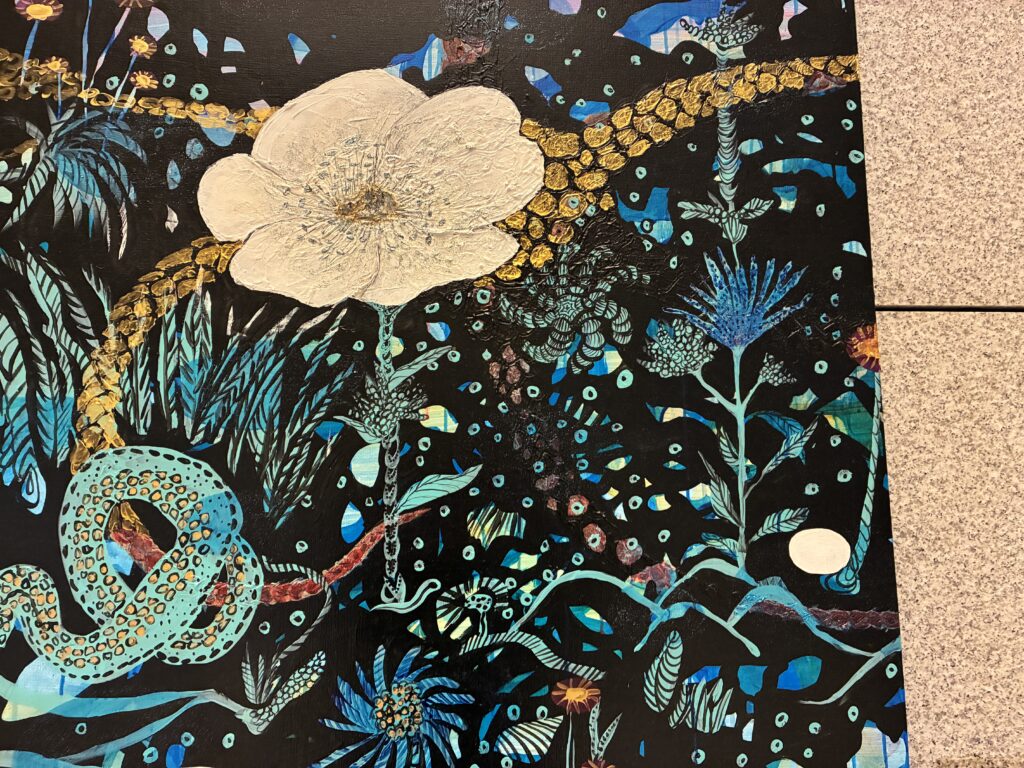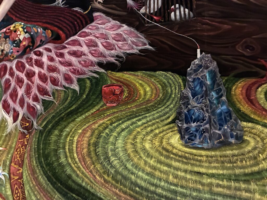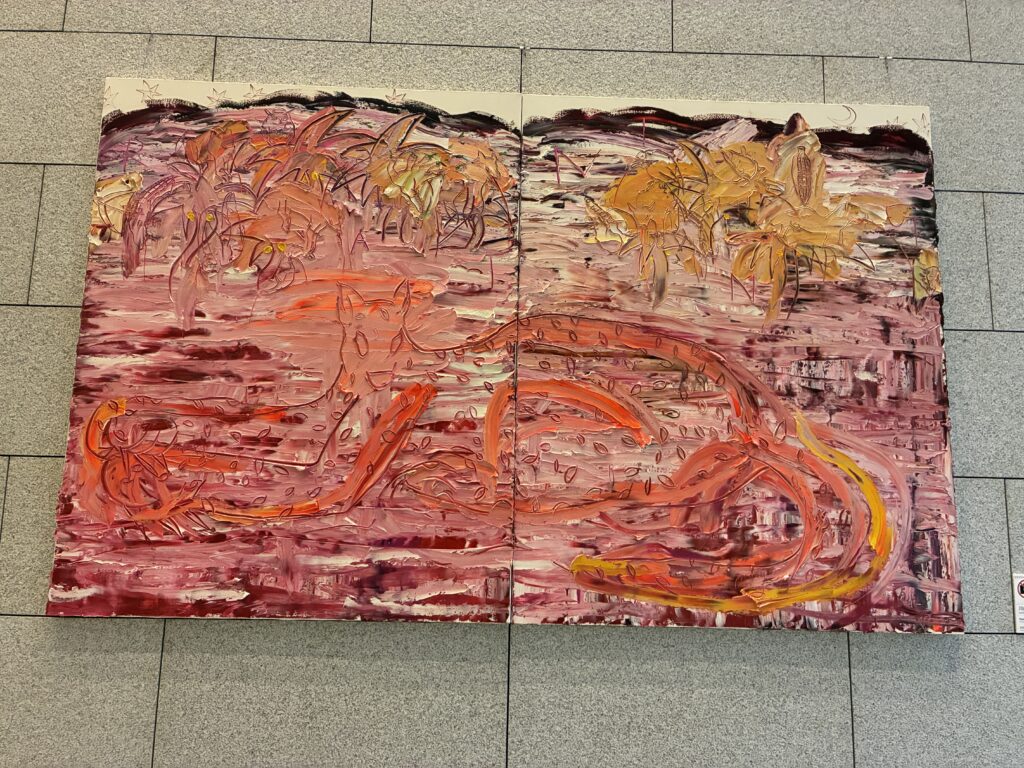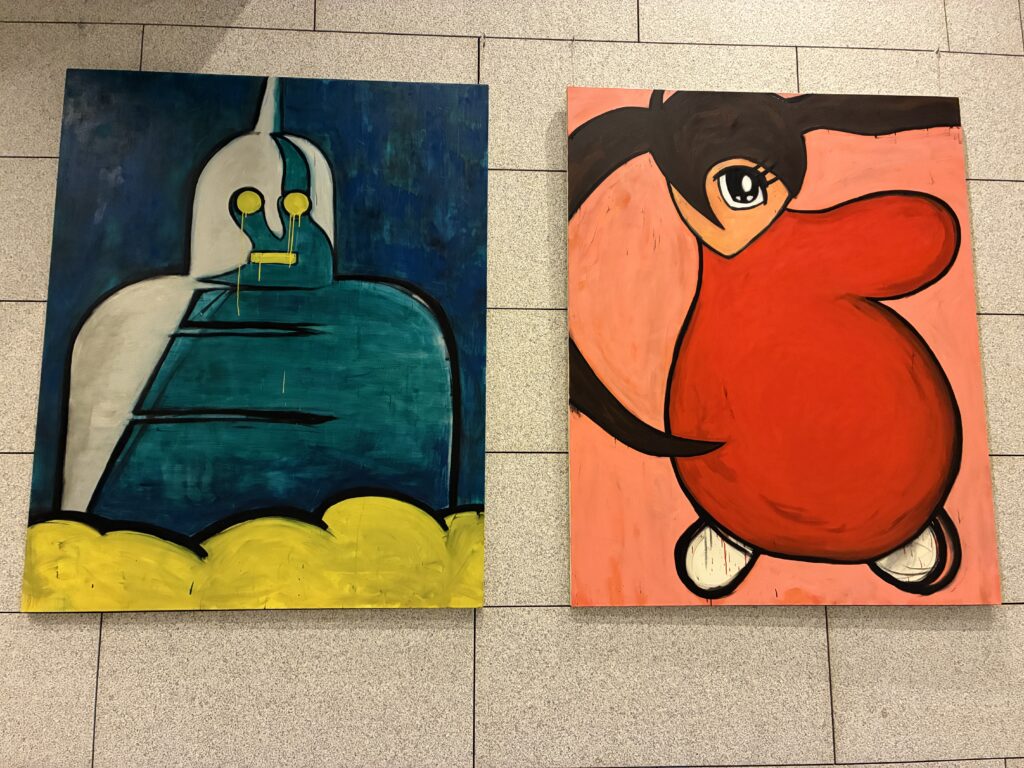 当初は背景に余白を残していたけれど、最近は支持体いっぱいに描くことにこだわっていると語られていた。
