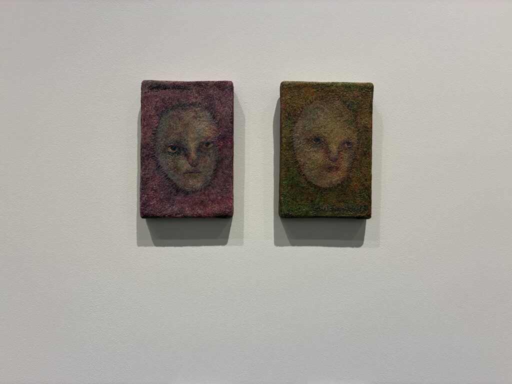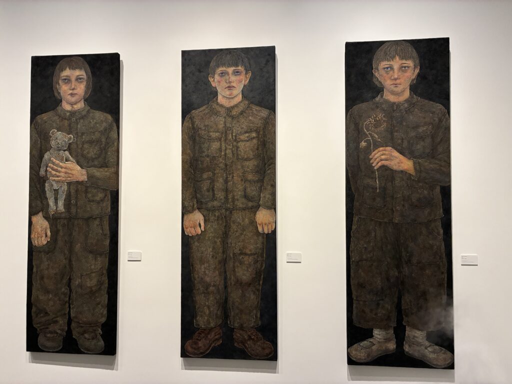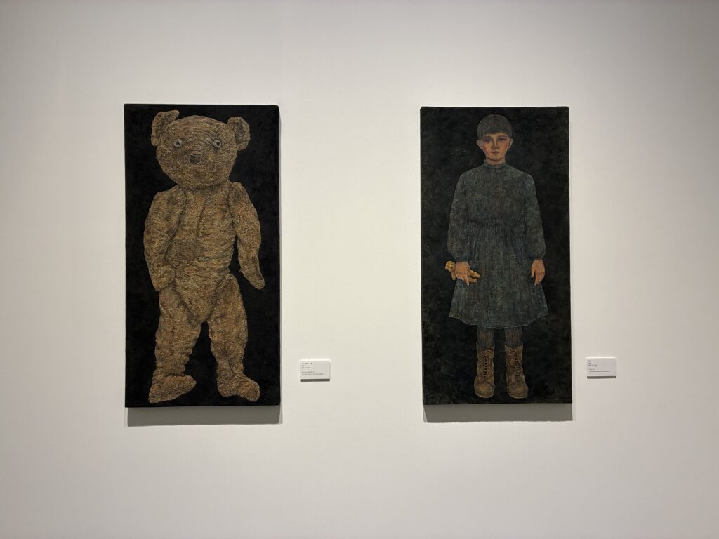 それぞれの人物が花やぬいぐるみなどのモチーフを手に持ち佇む作品群。