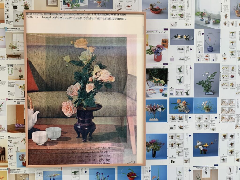 花のシリーズ。生け花の教本を壁紙にして作品を展示している。