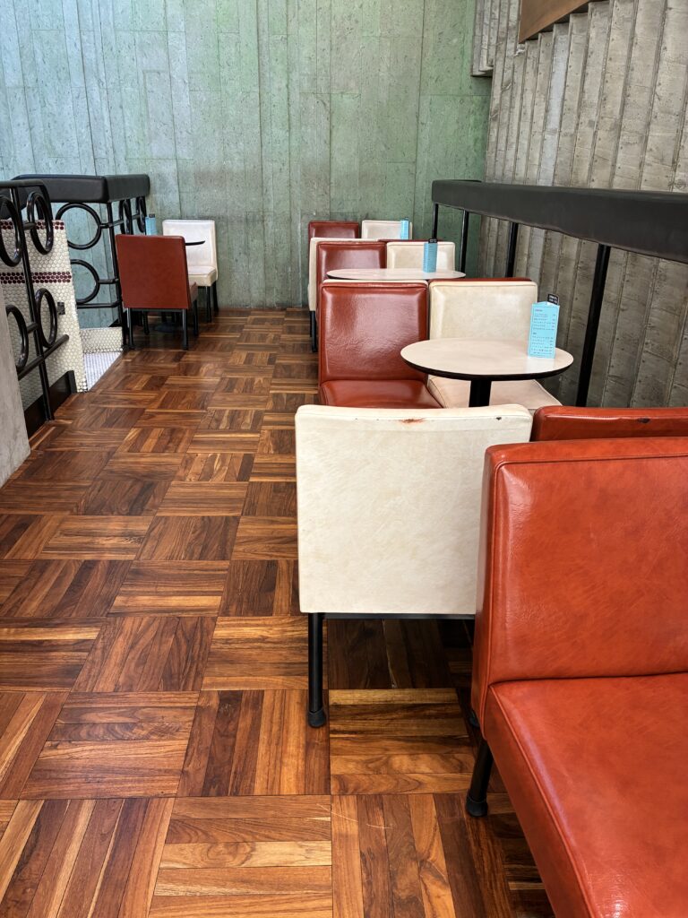 閉店する神田の純喫茶「珈琲専門店 エース」から引き継いだ茶色と白のチェアがレトロ感を演出している。