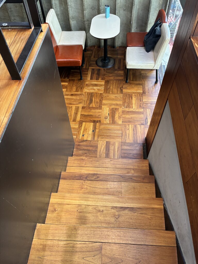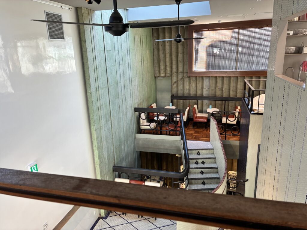 店内のタイル敷きの階段を上がるとカフェ空間がスキップフロア形式で現れる。