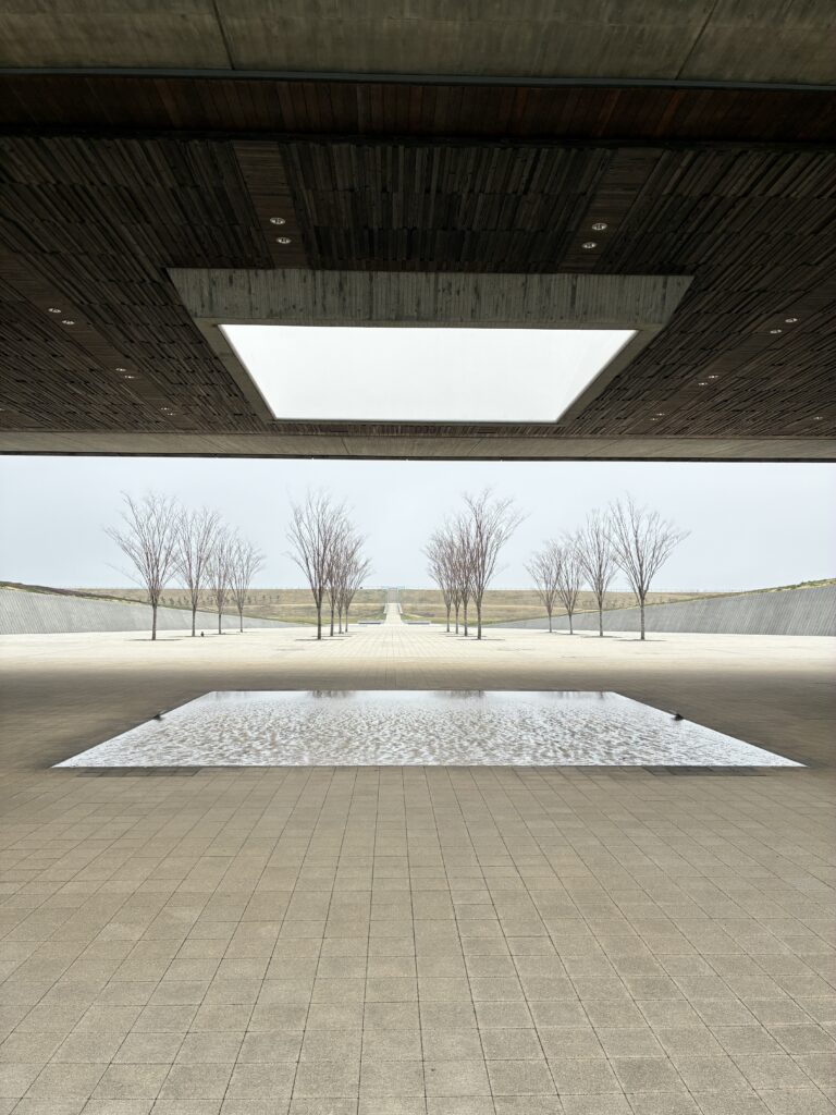 「祈りの軸」と「復興の軸」が交わる部分に水盤が設けられ、屋根の上から自然光が水盤を照らします。