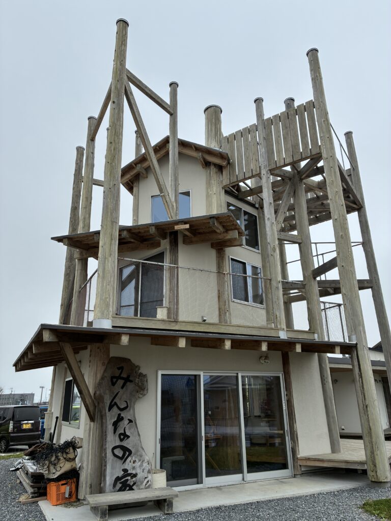 津波の塩害で立ち枯れした杉の丸太19本を柱に階段をらせん状に外周を回すように設置した木造2階建ての建築。