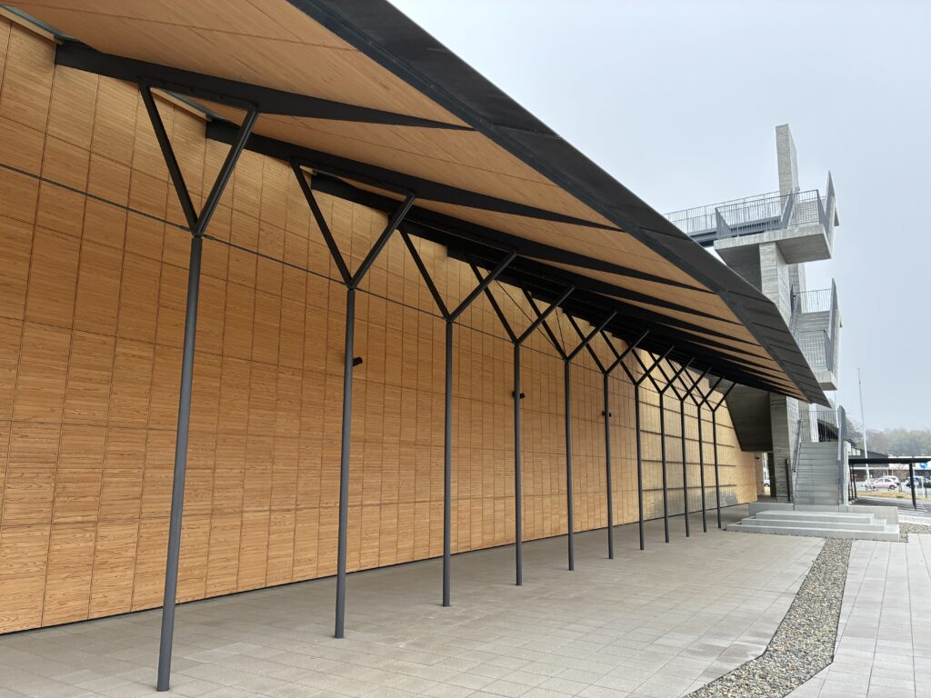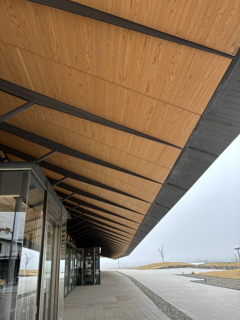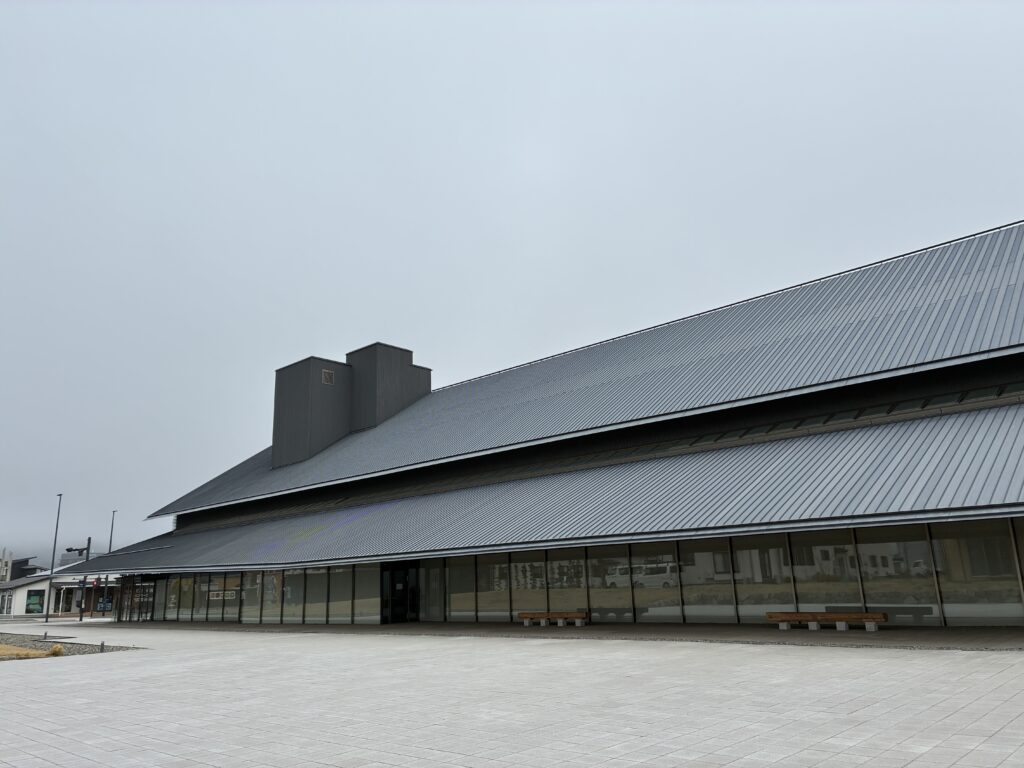 外観はチタン合金板のㇵの字の大屋根と岩手県産スギ材を用いた裳階(もこし)風の庇が特徴的です。