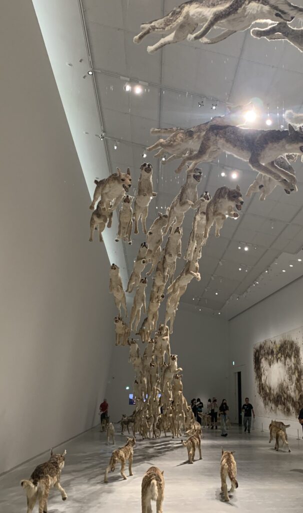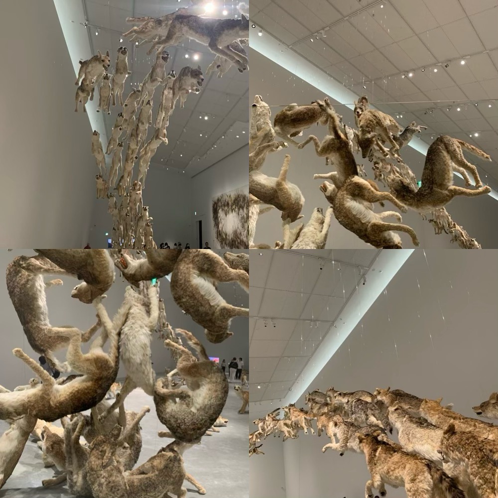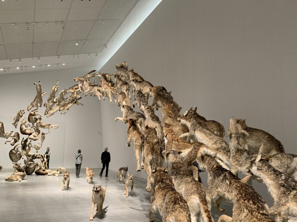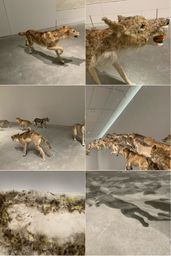 99体の狼の群れが全力で走り、ガラスの壁にぶつかる大型インスタレーション。