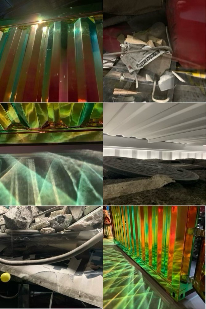 ビル解体を見据えた移送構想のもと、アスファルトや建築廃材などを輸送する状態を展示している。