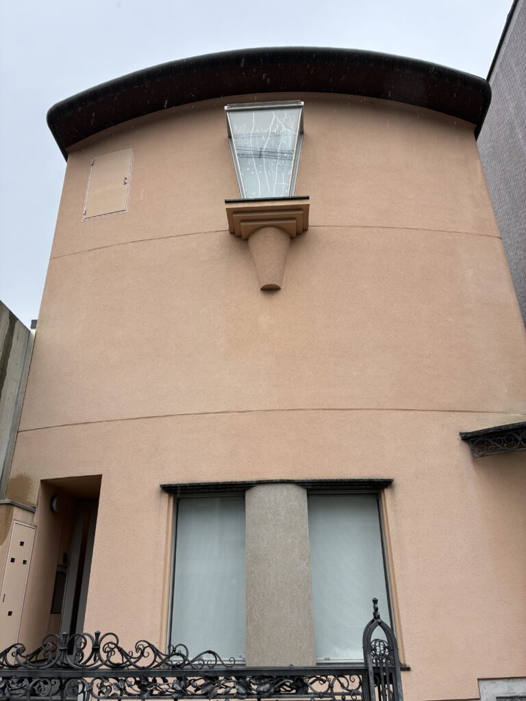 温かみのある薄オレンジ色の壁とアール・ヌーボー風の門扉が特徴的です。