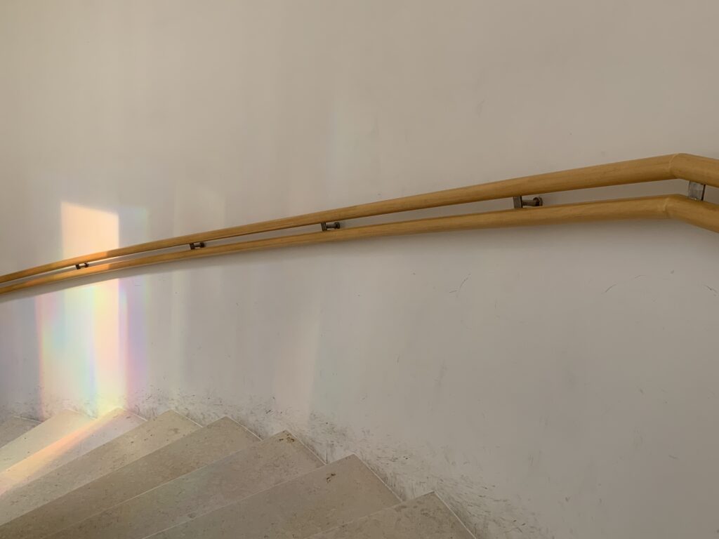 階段の途中にはめられたアクリル板に光が当たり、プリズムが現れる。