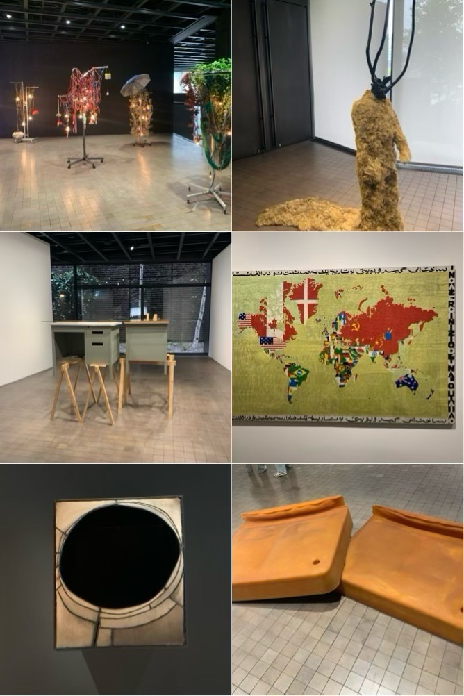 右中:アリジジェロ・ボエ「地図」国旗で領土を飾る作品。日本は赤と白に彩色されている。